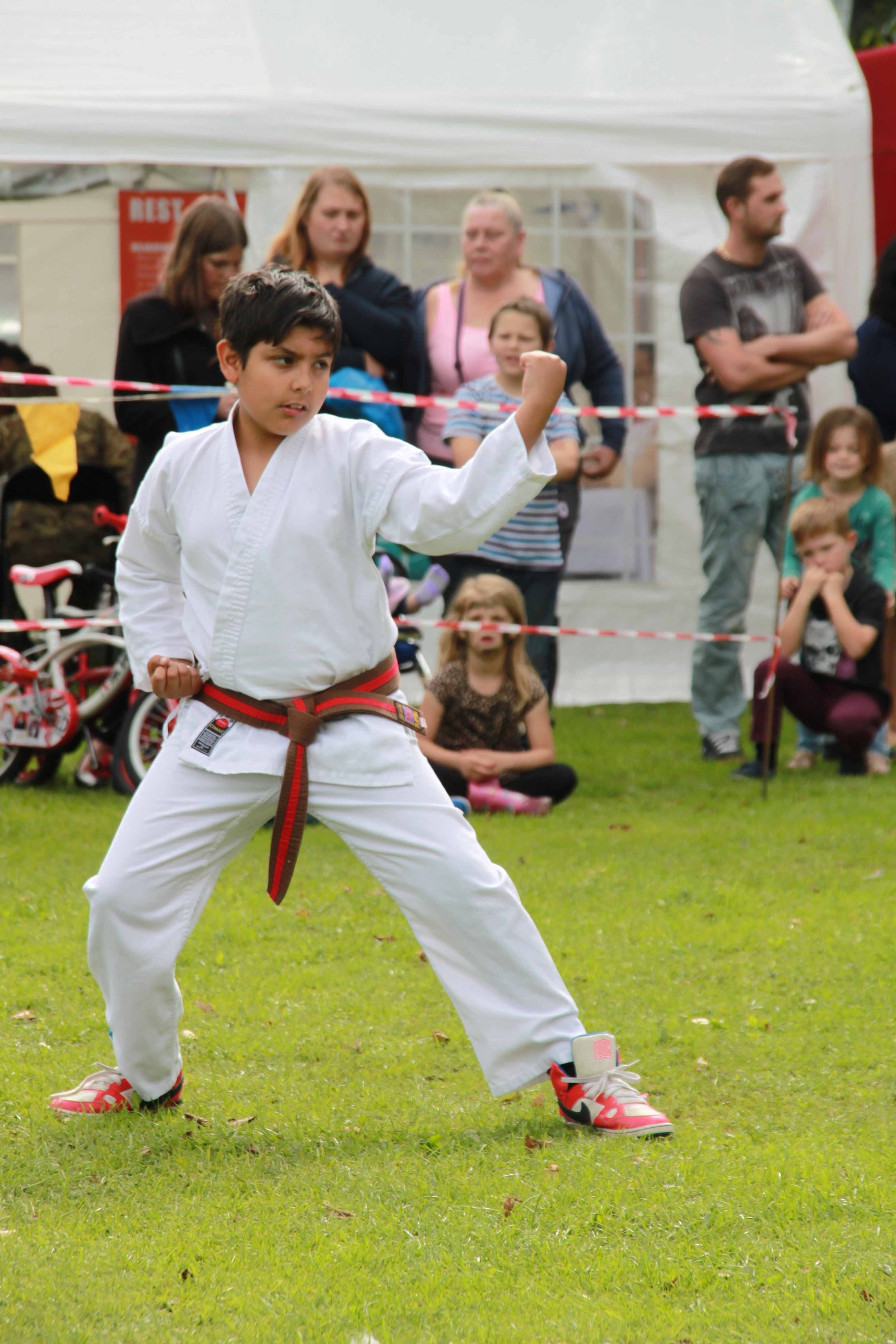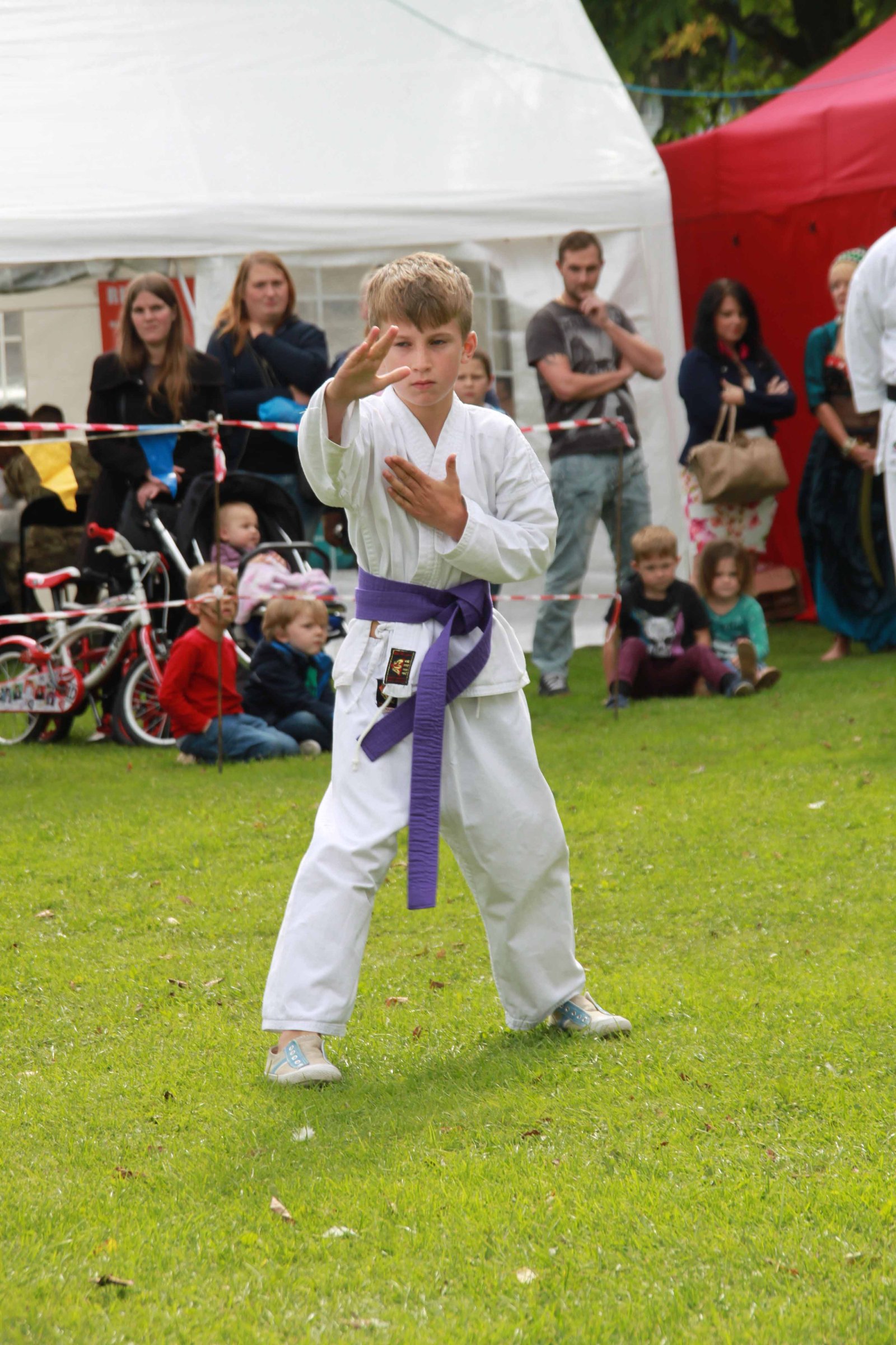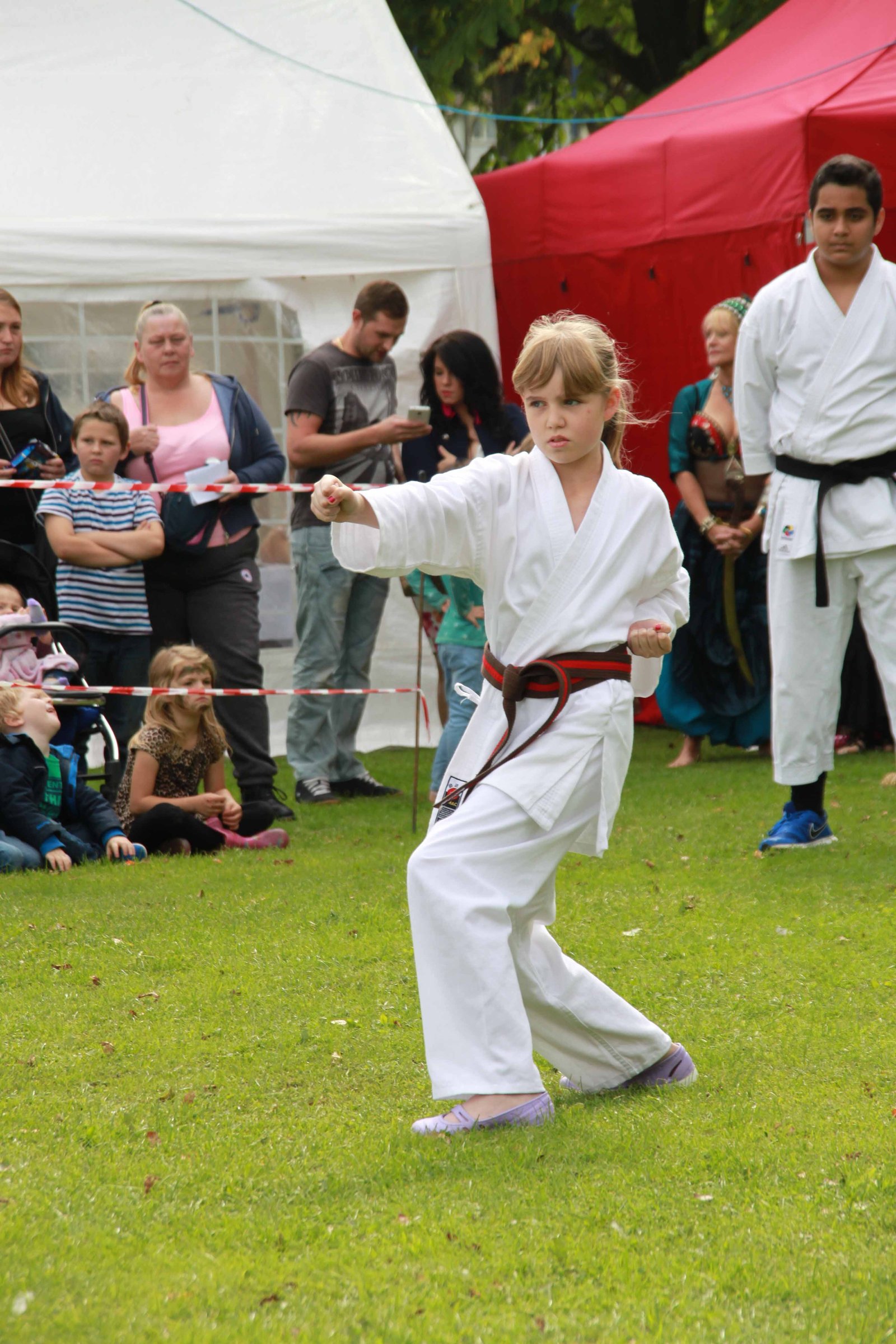 Bethany Bird demonstrating Kata Hangetsu (半月 Japanese: “Half Moon”), an advanced kata practiced in Shotokan karate. The first part of the kata is performed slowly, with emphasis on breathing and kime (tensing at the correct moment during a technique), while the second part consists of more explosive movements. Hangetsu consists of 41 movements and the Okinawan version of this kata is called Seisan. A very important feature is the hangetsu-dachi stance (half-moon stance).