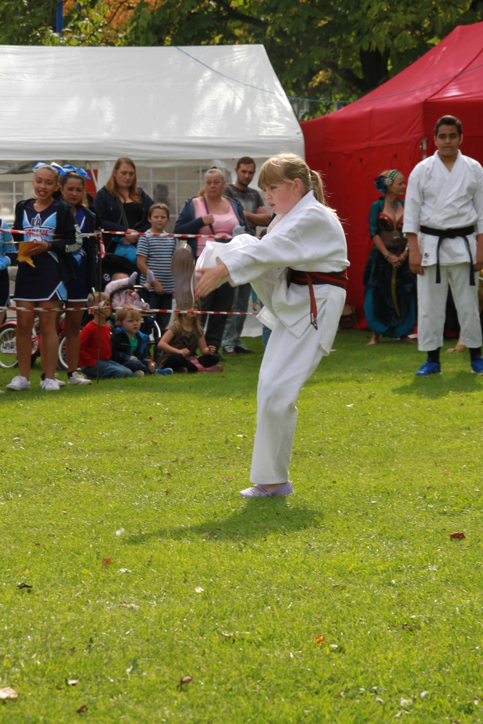 On Sunday, 13th September 2015, students from Weoley Castle Shotokan Karate Club demonstrated their skills at the annual Weoley Castle Fete. Guided by Sensei Susan Hession, 3rd Dan, students performed kihon (basic techniques), kata (pre-arranged form) and kumite (sparring).